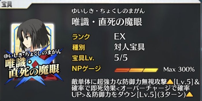 膨大なHPとガッツ持ち、さらにガッツ発動時に超高い宝具耐性を得るけど、即死は通る&星くれるので、即死宝具からのクリティカル追撃がベスト、みたいな……。
